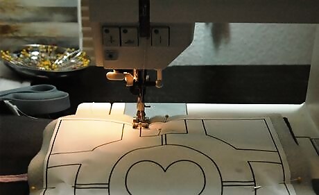 Using a fairly short stitch, sew along the pattern lines on the paper. Back stitch each section as you sew it, to prevent the seam unraveling. Lift the needle and pressure foot between each section. (Don't stitch any extra or connecting lines between sections.)