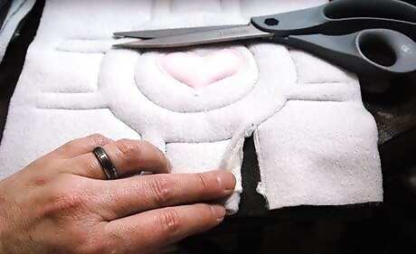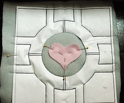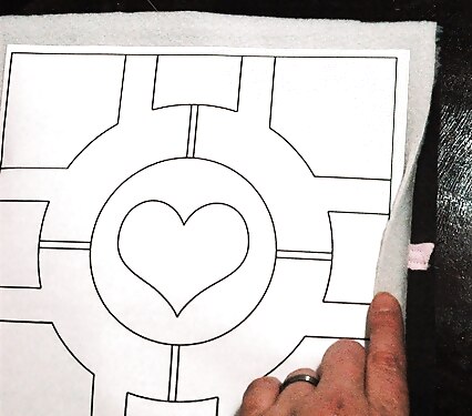 Orient and center a pink heart in the center circle. Pin it in place and top stitch it carefully to the center.