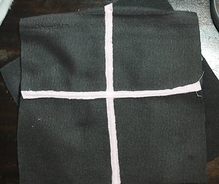 Sew a half inch (1 cm) pink strip to each of the center lines to form a cross in the exact center of the square. Make two parallel lines of stitching approximately 1/4 inch (6 mm) from each other on each pink strip. Trim the excess fabric away to leave only the narrow pink lines.