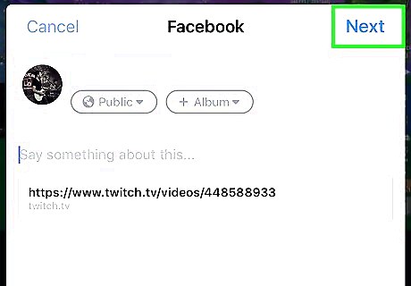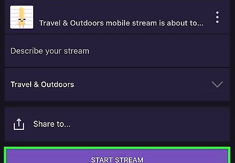 Tap Post. Anyone who sees the post on your feed can tap the link to view your stream. Facebook will close and you may need to open Twitch again. You will still be in the stream setup process.