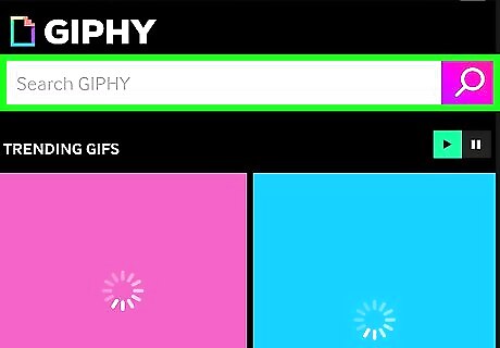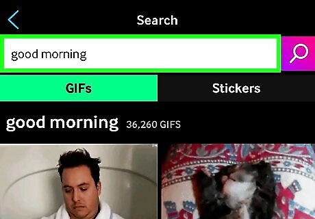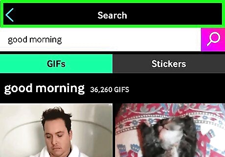 Tap the switch at the bottom of the screen to select ″Search GIFs.″ Do this only if the switch is blue and says ″Search Stickers.″ If the switch is purple and says ″Search GIFs,″ don’t tap it. Stickers and GIFs are similar because they are both animated. GIFs differ from stickers in that they square or rectangular recordings that look like videos.