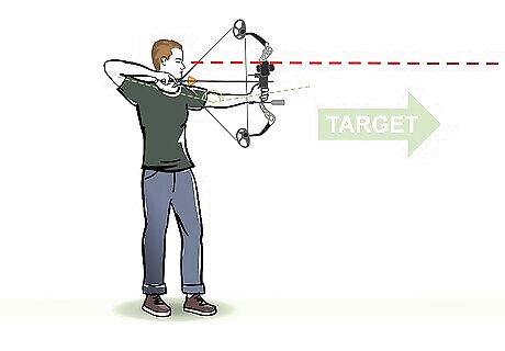 Align the pin on your sight with the center of your target, then make any final aiming adjustments. If you've been keeping your body still and relaxed throughout the motion, this should require only brief adjustments. If you moved the bow around a lot, you'll likely have to re-aim completely. Remember that your first pin is set for a target 20 yards away, and every pin beneath this is for further distances. Any aiming should be done with small motions, rotating from the hips.