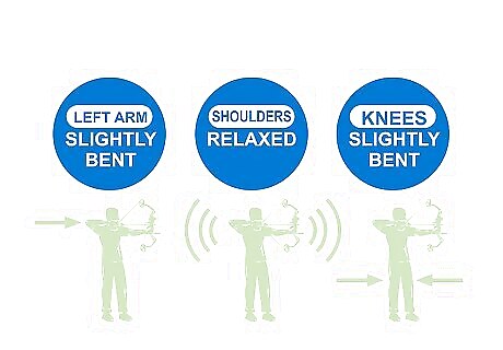 Focus on calm, fluid motions for all of your movements. Tense, tight muscles and jerky movements will greatly hurt your accuracy. So will trying to aim and shoot as quickly as you possibly can. Settle down, take a deep breath, and let your muscles relax. Try to think of gliding through every motion, working fluidly from one movement to the next. Your stabilizing elbow (left arm) should be slightly bent at the elbow. Keep your shoulders relaxed and chin up. Your knees should be slightly bent.