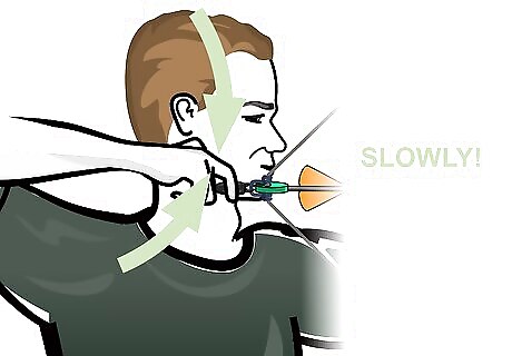 Draw the bow straight back, using your extended arm as a guide. You want to pull the bow back in a solid, fluid motion, keeping your bow arm straight on target the whole time. Your arm, extended in front of you, is a naturally straight line that you can use to guide your motion smoothly. For added drawing power, think about rotating your shoulder backward as you pull back, keeping the rest of the body in place. This activates your back muscles for added control. If you need a little extra power, you can slightly push the bow forward as you draw as well, though this should be avoided if possible. Your hips, bow arm, and feet should all be still while drawing. Avoid the temptation to move the bow around as you draw back. While moving forward slightly is common, don't point the bow up or down as you draw back. Once you have an arrow on the bow, treat it like a loaded gun. It only points at your target.