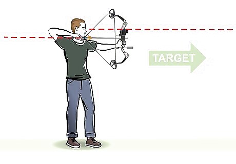 Keep your eyes on the target and your chin parallel to the ground. Strong posture is key to accurate shooting. So is staying still. Once you've planted your feet, found your target, and notched the boy, keep yourself in this angle and keep your eyes on the target -- the less you move, the less likely the arrow is to move off-target.