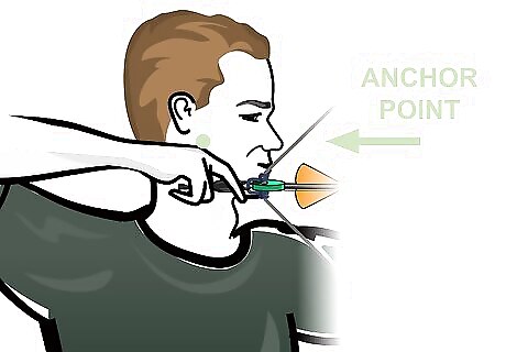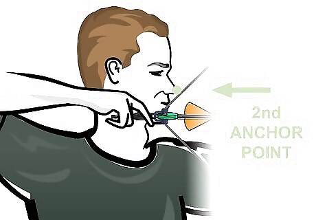 With the bow pulled all the way back, find your personal anchor point -- the place where you have the bow drawn fully back against your cheek. The anchor point is a personal spot every archer draws the bow back to. It can be anywhere, such as your thumb touching your ear, or your knuckles touching your cheek. The point is that you have a regular, common spot that you hit every single time when drawing the bow back. Play with your anchor point to find what is comfortable at first. However, once you find one you want to pull back to this point every single time. Keeping your anchor point regular lets you find and fix issues if you start missing the target.