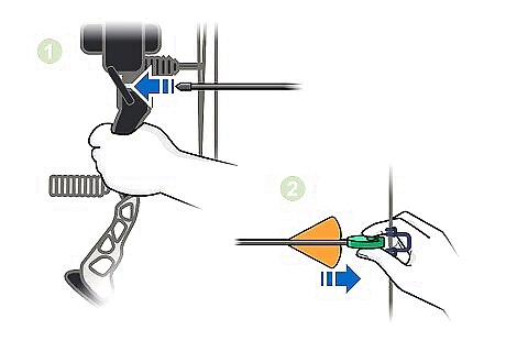 Notch an arrow into the rest, then snap it into the notch. Pull the back of the arrow into the string until it clicks into place along the nocking point. The string will have a small area with an extra string looping on it, forming a small semi-circle (called the "D-loop). The arrow is locked into the straight part, and you use the curved line to pull the string back.