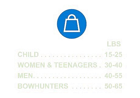 Lower the draw weight if you have trouble pulling the bow smoothly. The draw weight determines how hard you need to pull back on the string to fire the arrow. Too high and you'll ruin your form trying to get enough power -- too low and you'll have to pull the arrow back farther back to get the same shot. Many people start with 10lbs of draw weight. Typical draw weights by person include: Child -- 15-25 lbs Women & Teenagers-- 30-40 lbs Men -- 40-55 lbs Bowhunters-- 50-65 lbs