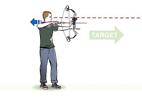 Keep the bow aimed and even with the target throughout your draw. Moving the bow, such as pointing upwards while you aim, may feel like it is easier. But it is a bad habit that simply forces you to re-aim, and the constant movement is not only unhelpful, but it could also be dangerous if you don't have full control over the bow.