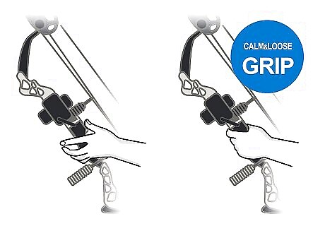 Grip the bow so the weight balances in the space between your thumb and fingers. You want the grip in the center of your palm, evenly distributing the weight across your whole arm. Don't rely on wrist strength (bow too far back) or finger strength (too far forwards) to hold onto the bow. Keep your grip calm and loose, not choking the bow to death. Gripping too tightly causes the bow to torque (twist when fired).
