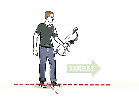 Start with your feet shoulder-width apart, at a right angle to your target. Stand so that your left side faces the target. You'll want to straddle the shooting "line", an imaginary line from you to your target. So, if you shoot right-handed, have your right foot (back foot) slightly in front of this line. Your toes should face forward in a way that feels comfortable; they don't have to point at the target. If you're left-handed, your right foot will lead, and you'll face your right side at the target.