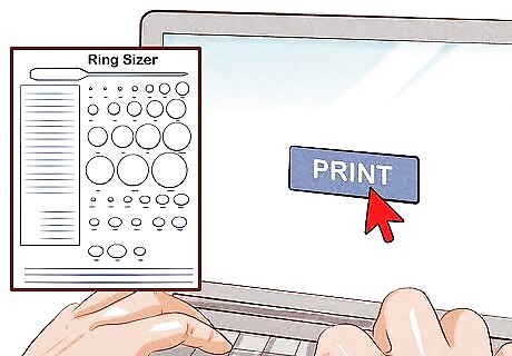Find a printable ring sizer and make sure your printer settings are correct. Search online for a printable ring sizer, which will have circles of various sizes across the page. To print the page, select “print” and open the settings in the print dialogue box. Make sure the print scaling option is set to “none.” If you’re having trouble getting the page to print, press “control” and “P” at the same time to bring up the print dialogue box.