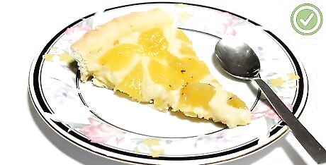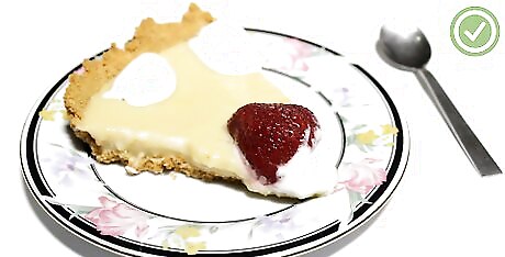Slide your pie server underneath the slice and lift the slice out. When you lift the slice out, start slowly when you lift it to make sure that the piece comes away from the pie cleanly. Make sure to use your finger or hand to support the piece when you lift it away so it doesn’t fall off. Once you’ve removed the slice, you can put it on a plate and it’s ready to eat! Because your pie is out of the container you baked or chilled it in, you are easily able to get the server underneath the crust. Make sure you use a sturdy, metal pie server for this part.