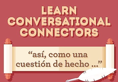 Learn conversational connectors. Conversational Spanish is different from the written language. Conversational connectors add space and let your bridge ideas with phrases. Only use one or two connectors to begin with as it is extremely difficult to memorize all of them at once. Simply use enough to get you through a conversation and, as you begin to gain more confidence with the language, incorporate more into your everyday vocabulary. They can range in a variety of categories but focus on: Filler ex “well, as a matter of fact…” Quoting ex “recently, I heard that…” Apologising ex “Don’t be upset, but...” Agreeing/Disagreeing ex “most certainly” Passing ex “and what do you think?” Closing ex “to sum up...” Elaborating ex “to be more precise…” Opening ex “that is a good question…” Qualifying ex ”to tell the truth…” Switching ex “by the way..”