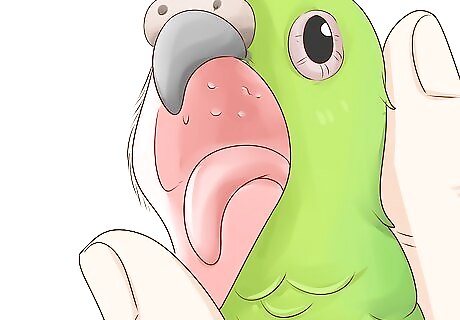 Look for white spots inside the bird’s mouth. One of the biggest tell-tale signs of vitamin A deficiency can be observed by inspecting the parrot’s mouth. A vitamin A deficient parrot will have small white plaques (spots) on the roof of its mouth, or at the base of its tongue. These plaques eventually become infected, and cause large abscesses that can block the opening of the windpipe and cause labored breathing. These symptoms are typically a red flag that your bird definitely has a vitamin A deficiency. The bird’s mouth may also seem slimy, or have very foul-smelling breath. Additionally, the bird may have trouble swallowing or refuse to eat.