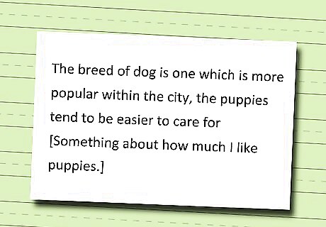Keep writing when you feel stuck. Sometimes trying to get one sentence or section “perfect” can prevent you from continuing to write. If you find yourself getting stuck on a particular sentence, write a “placeholder” sentence and move on. A placeholder sentence may look like this: [Something about how much I like puppies.] You may want to mark any placeholder sentences with brackets or by highlighting it in the word processing program (or on paper if you’re writing a draft by hand).