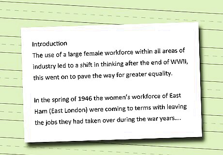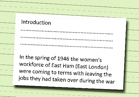 Write a hook. A hook, often the very first sentence in your paper, is a sentence or two that “hooks” or grabs the interest of your audience. Commonly used hooks may be good for novice writers, but some college professors think that certain hooks are overused. A few ideas for hooks follow. A statistic (particularly one that seems surprising to the reader) can be a good way to start certain types of papers. Be sure the statistic is from a reliable source, like one from your school’s library database. A personal story or anecdote told in detail can draw the reader in. It should, however, be relevant to the topic, and you will need to explicitly connect it to your thesis statement. This may not be appropriate in a formal essay. A quotation from a famous person can be a good lead-in. However, since this is one method that has been overused, try putting a twist on this method by using a surprising quote, contradicting the quote, or using it in a new context. You will also need to connect this to your thesis clearly. Illuminating a paradox or puzzling scenario could draw your reader in by making them question something that is usually taken for granted. Try to avoid introductions that start by giving a dictionary definition of a word and explaining it or by asking a question. Avoid over-used and essentially empty phrases like “from the beginning of time” or “throughout the history of mankind.”