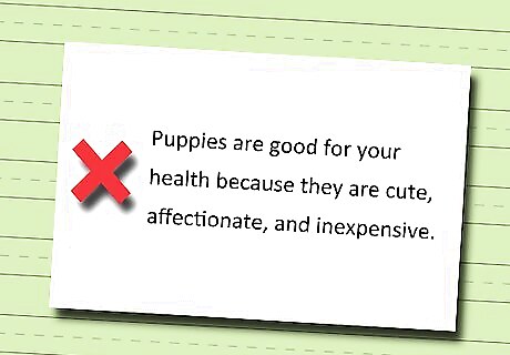 Avoid the "three-prong" thesis. An example of a typical three-prong thesis might be "Puppies are good for your health because they are cute, affectionate, and inexpensive." The trouble with thesis statements such as these is that they can severely restrict your essay development. You may feel the need to use only one paragraph to discuss each prong rather than developing your ideas as much as necessary.