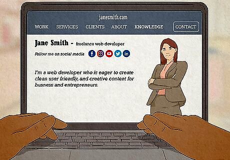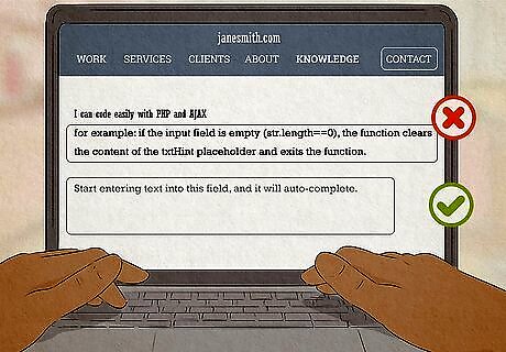 Add catchy content to your site. Focus on your key areas of expertise, and display them professionally. Much like you would do when having potential employers contact references, put your best foot forward for potential clients. Include descriptions, where appropriate or necessary. Don't use jargon. If you are offering technical expertise, include descriptions that appeal to your client base, not your peers. For example, if you are showing that you can code with PHP and AJAX, don't say "in this case, if the input field is empty (str.length==0), the function clears the content of the txtHint placeholder and exits the function." The person who needs you to work on their site will just scratch their head and say "huh?" Say, instead, "Start entering text into this field, and it will auto-complete."