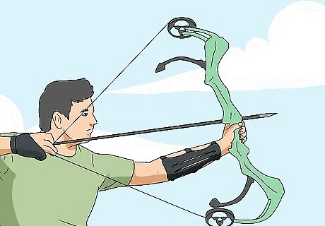 Master the fundamentals. Archery has a diverse range of options, from hunting to riding on horseback shooting at moving targets. Before you get into advanced shooting, you need to perfect your stance, get comfortable with gripping and drawing the bow, and become accurate at aiming. Another good skill is learning to account for wind or other weather. Once you have learned the basics, you will probably practice without a teacher most of the time, but it’s good to check back in with an instructor after you’ve been shooting a while. They can watch you shoot and make sure you are maintaining proper form. Don’t get discouraged if you don’t start hitting bullseyes right at the beginning. Archery is a discipline and it can take years to become an expert shooter.