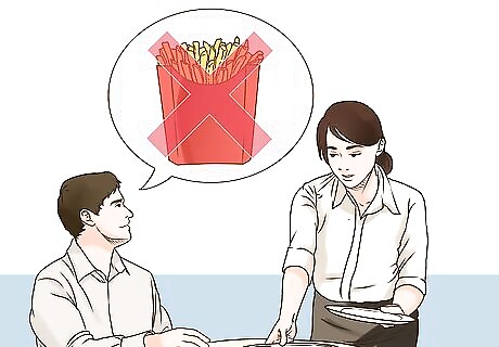 Eat healthy if you dine out. While eating out with your friends is especially enjoyable on the weekend, it’s easy to slip up and blow your healthy habits. As a result, you need to choose wisely when picking meals you don't prepare yourself. Avoid foods with lots of carbs. Stay away from fried foods or oily foods. Focus on lean protein. Pick foods with fresh vegetables. For example, when picking an appetizer, try a vegetable plate with hummus instead of fried mushrooms or French fries. Stick to healthy habits when you get takeout, too.