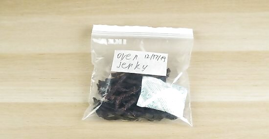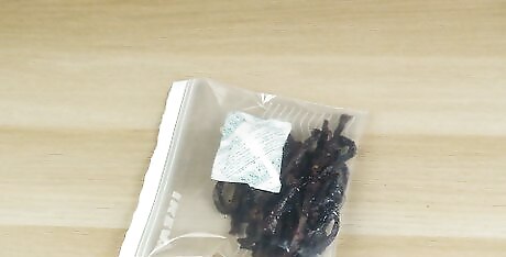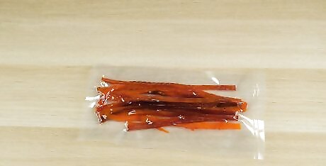 Add oxygen absorbers to your bag or jar to extend the jerky’s shelf life. You can purchase food-grade oxygen absorbers from some grocery stores or online. Place 1 or 2 of them in each bag or container of jerky to extend the shelf life of the jerky. Then, press the air out of the bag and seal it or put the lid on your storage container. The oxygen absorber will absorb the oxygen, which prevents bacteria from growing on the jerky.