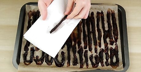 Dry the jerky at room temperature. If you've made your own jerky, let it cool for several hours so it's completely dry. If you see grease on the jerky, blot it with paper towels. Removing the moisture and fat helps the jerky last longer when you store it. If you're storing store-bought jerky, you can skip directly to storing the jerky at room temperature or chilling it.