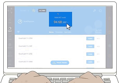 Manage your Ripple funds with the Gatehub website. After you make your wallet, you can use your Ripple to buy items online, trade for other coins, or save for later cash-out. Select “Wallet” from the left-hand side, and review your Ripple balance. Additionally, you can send payments, view transactions, or look at open orders through your Gatehub account.