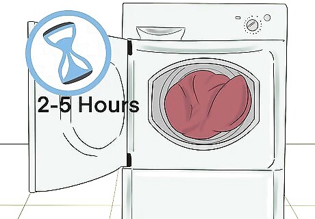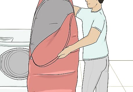 Dry your bag on low-heat tumble dry if you machine-washed it. Grab the bag out of the washing machine and support its entire weight with your arms while you transfer it to the drying machine. Dry it on the lowest heat setting for 2-5 hours or until it is completely dry. Sleeping bags are easier to tear and damage when they are soggy and heavy, so this is why it’s important to support the whole weight of the bag when you transfer it to the dryer. You can throw 1-2 tennis balls in the dryer with your sleeping bag to help fluff it up again. Using a drying machine is only necessary for sleeping bags that are totally wet from a washing machine. If you spot cleaned your sleeping bag, you can just hang it to air dry.
