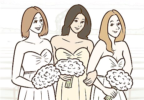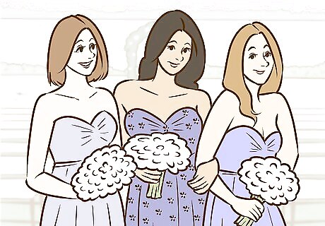 Tie everyone's looks together with matching bouquets. If you want everyone to look similar but different, use bouquets to your advantage. You can have matching bouquets made. You can also have bridesmaids hold bouquets with the same flowers. If you're using a particular color scheme for your dresses, have the bouquets match this color scheme.