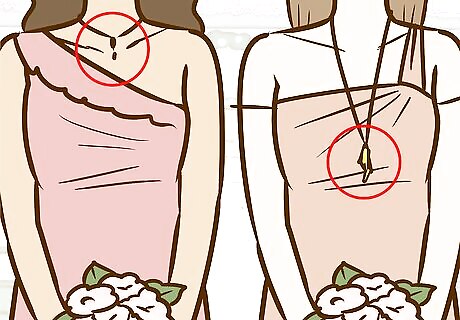 Use matching accessories. Similar or matching accessories can help make mismatched bridesmaids dresses look more uniform. Everyone can carry the same clutch bag, wear the same necklace, or wear similar earrings. This can help if your dresses are a different style or color.