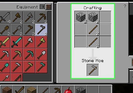 Make a stone pickaxe, sword and hoe. Destroy tall grasses to collect seeds; plant the seeds on tilled grass to plant them. To till grass, use your hoe. They will grow into wheat after a little bit. Destroy them to harvest them and turn the harvested wheat into bread. By this time it should be nighttime.