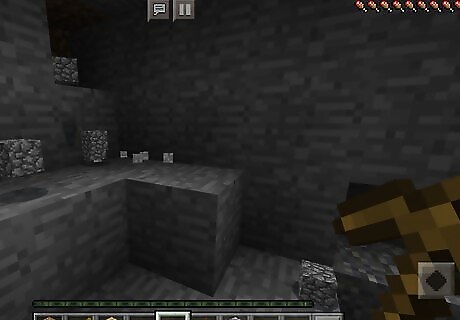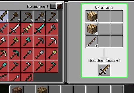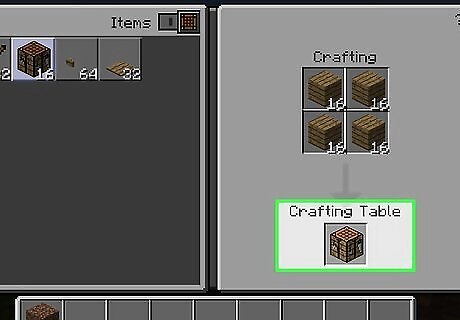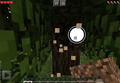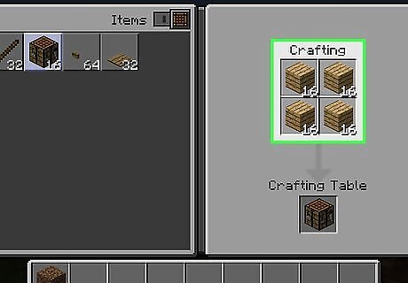 Punch trees. When you’ve collected about 15 pieces of wood, craft them into wooden planks by tapping the button in the bottom right corner with 3 dots on it. This will take you to your inventory. Tap the button in the top left corner that shows a picture of a brown block. This is a crafting bench(It's the middle tab). It will take you to your crafting.
