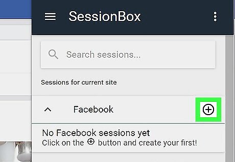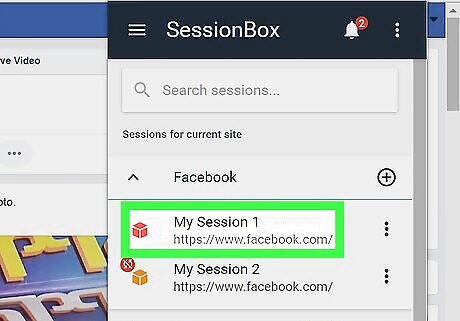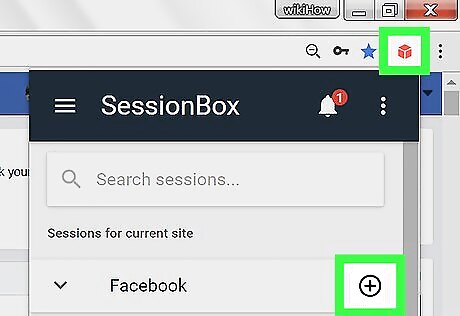 Create a new session in SessionBox. You can use your second session to log in to your second account on the same website. Click the SessionBox icon on the top-right. Click "+" next to Facebook. Click OK to create "My Session 2."