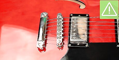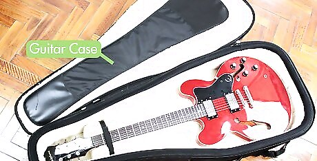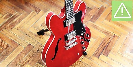 Treat your guitar with care. Treat guitars how you would treat guitars at the store, or maybe your other valuable possessions. Never lay it down on the ground when you are not playing it or doing maintenance on it. The best place for your guitar is inside it's own fitted case or something that will hold it properly. You can choose between a hard case, or a gig bag, or hang it on a wall hanger or stand it up on a floor stand. If you have an electric guitar, try loosening the strings a bit so you can remove the dust that most likely has gathered around the pickups. If you have an acoustic, loosen the strings and remove the dust by the bridge. You don't need to loosen them much, just enough to get a cloth underneath. *Prod the hardware to see if it is loose, and if it is, see if there is a screw you can tighten.