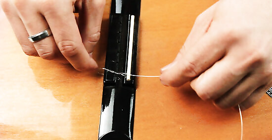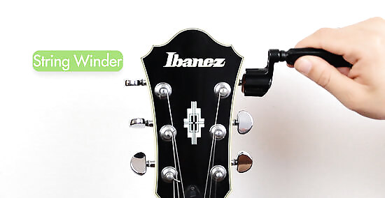 A real nice thing to possess is a string winder, it makes the process of unwinding and winding string much easier. It is not a required tool however, but most certainly recommend that you should use, just in case of accidental string breaks on stage. First, you unwind the string at the machine head. Keep on turning until the string is so loose you can wind off the string with your hands and removing it from the machine. Then, you go down to the bridge and notice how the string is fastened there.