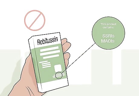 Avoid taking Robitussin with SSRIs, MAOIs, and other cold-relief medications. Combining prescription or over-the-counter medications with Robitussin can increase the risk of unpleasant side effects and, in some cases, lead to severe conditions like serotonin syndrome. Talk to your doctor before taking Robitussin if you take any of the following medications: Trazodone (Desyrel, Desyrel Dividose, Oleptro) Diphenhydramine (Benadryl) Gabapentin (Neurontin or Neuraptine) MAOIs (Azilect, Eldepryl, Zelapar, Marplan, Nardil, Parnate)