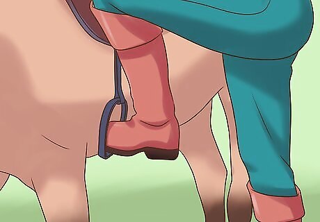 Use the rest of your body to cue the turn. At the same time as you're using your reins to cue the horse to turn, use your leg muscles and body weight to drive the point home. Apply gentle pressure with the calf of your outside leg (the leg on the side opposite the way you're turning) just behind the cinch. Simultaneously, look in the direction of the turn and ever-so-subtly shift your weight to guide the horse into the turn.