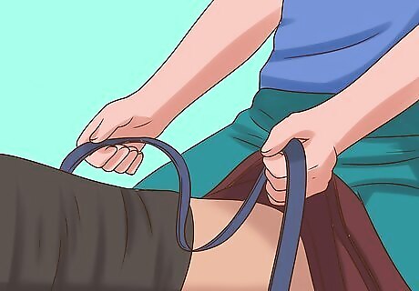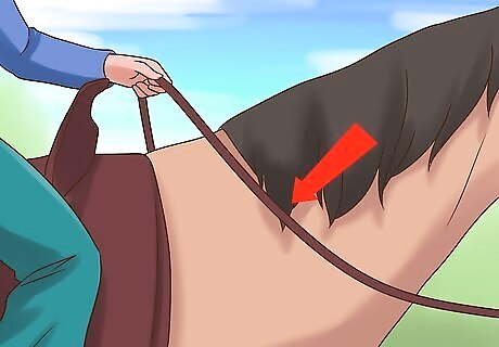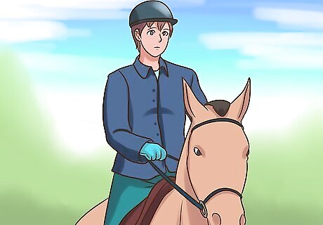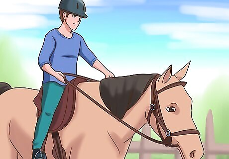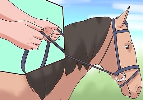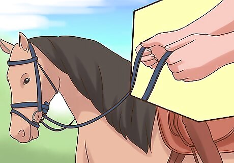 Mount up. Start by getting your horse ready to ride. Saddle your horse and connect your reins to a smooth-cheek snaffle bit. You may use either one-piece or split reins. The reins should be long enough that they can be held with one hand behind the center of the horse's neck — usually, for split reins, this is about seven and a half feet. Don't use a shanked bit, as this can be painful for the horse to learn with. Some riders choose to eventually switch to a shanked bit once the horse learns this skill.