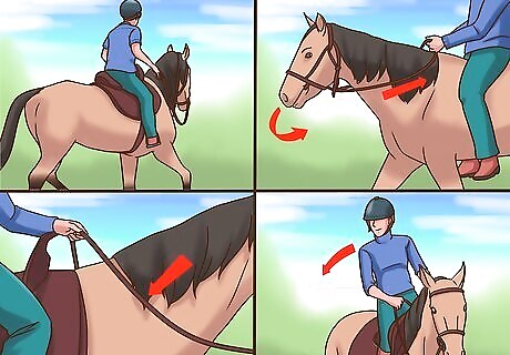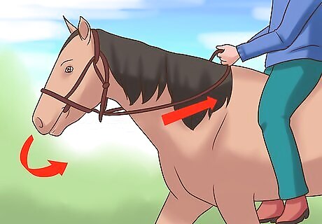Turn the horse with a direct rein. When you're ready, cue your horse to turn with a direct rein. In other words, gently guide the horse's nose to the side that you want to turn by pulling on the rein on that side. For example, if you want the horse to turn left, pull on the left rein so that the horse's nose turns slightly to the left. The rest of the horse's body should follow.