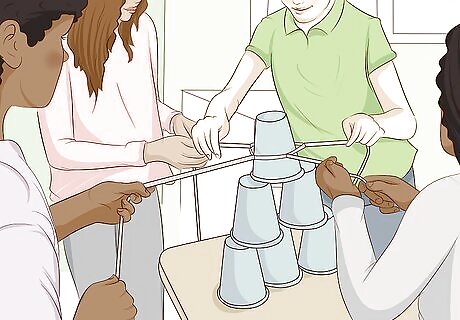 Use the rubber band-cup challenge to teach them to complete a task together. Divide students into groups of 4 or 5. Tie strings to a rubber band, and give each student 1 string. Students pull on the string to stretch out the rubber band, and then slip it over a cup. Then they release the rubber band to grasp the cup and lift it with the strings. Have the students build a simple structure, such as a small tower. Students will also need to communicate, practice patience, and work together to build the tower.