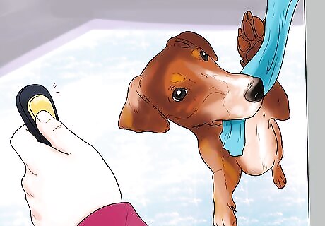 Praise your dog for biting the towel or rope. Once he knows paying attention to the towel or rope is an avenue for rewards he will expect them. Now, you want to start training your dog to open the door on command. While standing near the refrigerator (i.e., close enough to point and touch the towel or rope), use a command such as "Open the fridge". Click and reward when he successfully bites the towel or rope. Your dog may not initially understand the new command. He has been getting rewards without it so far. First, click and reward when he touches the towel or rope. Second, stop clicking and rewarding for just touching the rope. He will get aggravated and naturally bite the rope. Any motion to bite the rope should get a click and reward (e.g., touching it with his teeth or licking it). Don't move on until he actually bites the rope or towel.