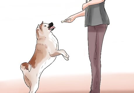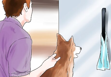 Teach your dog to move to the correct side of the door. This can be difficult because he is not doing anything specific. Try putting a treat between your fingers. Then put the treat in front of their face. Without releasing the treat, move your hand toward the spot you want your dog to be (i.e., behind the door). When your dog gets behind the door, release the treat. If you already have a command for your dog to sit on a specific spot or on or near an item or blanket, use that to get your dog to move behind the door. Place the item he sits close to or on behind the door, and use the proper command.