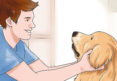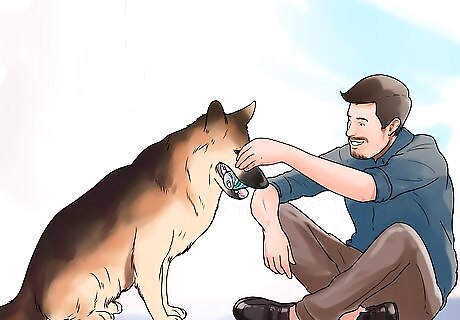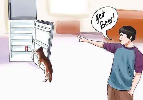 Praise your dog when he brings you a beer. This time you want to do the same thing with the second command. Open the refrigerator. While standing in front of the refrigerator, give the "Bring me a beer" command. Click and reward when he completes the task. Then repeat the task as you move farther and farther and into a different room.