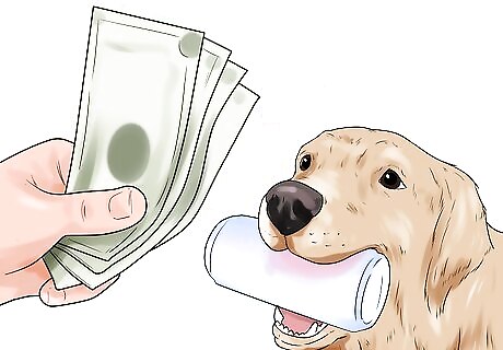 Praise your dog for trying to bite the can. As your dog investigates the can, he may engage in a number of behaviors. Any behavior that is closer to biting and picking up the can should receive a click and a reward. He may first sniff. Then he may lick. Then he may try to bite the can to carry it to another spot for more comfortable licking. Your dog may start licking the can profusely. It is cold, and licking the can will provide a very novel experience for him. If he starts doing nothing but lick the can, stop rewarding him for licking the can. If it takes a while to get your dog to bite the can, replace the can with a cold one from the refrigerator. This way he is biting and picking up a cold can instead of a lukewarm one. If you have a "pick it up" command typically used with a ball, use that command to teach the dog to pick up the beer can.