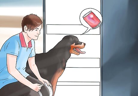 Make the fridge easy to open for your dog. Although your dog will likely get into anything you leave out, you probably take for granted the fact he can't get into the refrigerator. To make it easier for him, hang something from the handle of the refrigerator door. A rope with a thick knot on the end works particularly well for this, but a towel will work too. Just make sure it is properly secured to the handle. If you decide to use an old rope or towel (i.e., something you don't mind ruining), check the integrity of the threads. If strands come off or it rips with little effort, find something newer. The fibers and dust will distract your dog and may be harmful to his health.