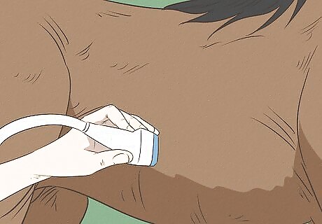 Obtain the proper supplies. Your equine veterinarian will perform the ultrasound, and will thus supply the necessary instrumentation to perform the ultrasound. Supplies include an ultrasound machine, a five-megahertz transducer, and a portable viewing stand. Your veterinarian may also bring a printer to print out the images. The ultrasound machine will transmit high-frequency sound waves through the transducer. When the sound waves hit a barrier between body tissues (e.g., soft tissue and bone), they will get reflected back to the transducer and then relayed back the machine to produce a two-dimensional image (called a sonogram). Because your mare will need to stand still during the procedure, your veterinarian may want to use fly repellent to keep away any distracting flies.