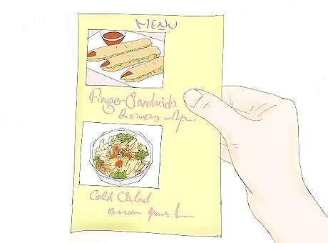 Decide on a menu. Bridal showers have been known to produce quite a few tears as well as laughter, both of which make for some hungry tummies. Keep the time of your party in mind when creating your menu; a morning shower would be perfect for a brunch. Some food ideas for your shower: finger sandwiches, cookies, cold salads, veggies and dip, chili, crackers and cheese, etc. If guests have offered to bring desserts and other treats, call to confirm what they plan to bring -- adjust your recipe plans accordingly.