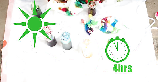 Prepare the dyes. Take the tie dye bottles provided with the kits and/or purchased separately and remove the caps. Then, fill the bottles up with cool or room temperature water to the fill line. Then, cover the bottles with the caps again and shake the contents until the powder has fully dissolved in the water. It is important to shake the bottles well or else you may end up with inconsistent dye colors or even some black speckles on your tie dye items.