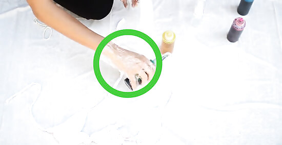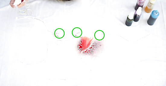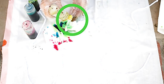 Apply dye to the fabric sections. Use your dye and/or spray bottles to squirt the dye onto your secured segments. Apply the dye in the desired pattern. For example, you might use pink on one section, then green on the next section, and then yellow on the next section. Make sure that you squeeze enough dye onto the sections to saturate the fabric through to the twisted layers. Otherwise, you may end up with undyed white spots on your bikini. Don’t forget to wear gloves on both of your hands to avoid staining your hands while you dye the bikini.